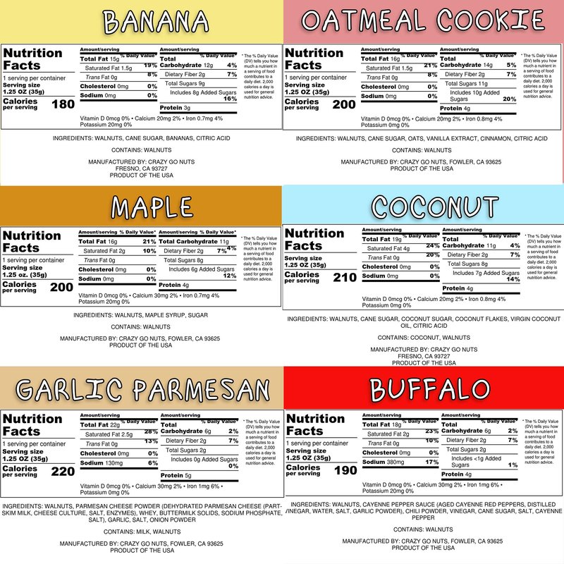 Crazy Go Nuts Walnuts Sampler 6-Pack - Banana, Buffalo, Coconut, Garlic Parmesan, Maple, and Oatmeal Cookie - Healthy Snacks, Gluten Free, Superfood, Natural, Omega 3 Fatty Acids, and Antioxidants