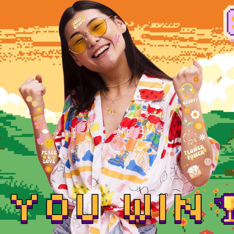Crazy Night Groovy 70s Temporary Tattoos - 132 Styles | Flower Power Birthday Party Supplies, Good Vibes Smiley Favors, Hippie Party Accessories