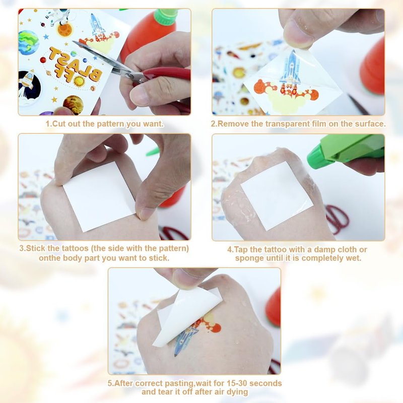 - 【Easy to apply】1.Cut out the pattern you want. 2.Remove the transparent film on the surface.3.Stick the tattoos (the side with the pattern)on the body part you want to stick.4.Tap the tattoo with a damp cloth or sponge until it is completely wet.5.After correct pasting,wait for 15-30 seconds and tear it off after air dying.PSYou can also watch the product video.