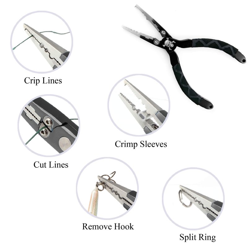 - √ Multi-function Jaws: Teflon coated Stainless steel Jaws, for grip line, split ring, crimp lead andsleeves