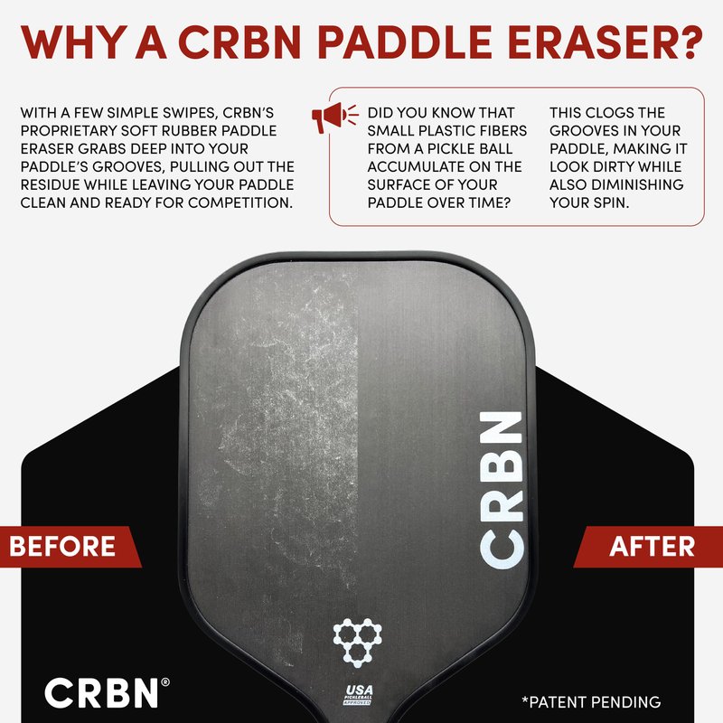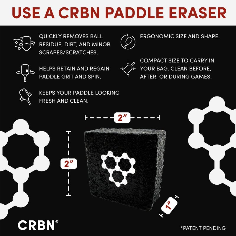 The first of its kind–CRBNâ€s Paddle Eraser is designed specifically for cleaning ball fibers off the surface of any carbon-faced paddle!