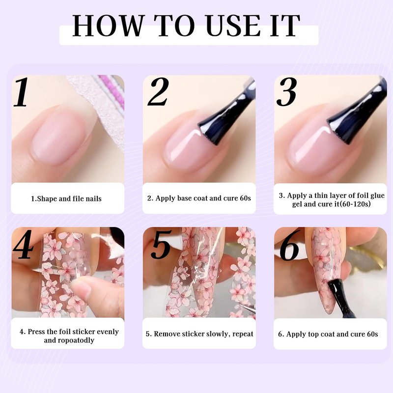 - Easy Application and Removal: Applying the transfer foil for nails is as simple as using regular nail polish, thanks to the built-in brush. Cure the foil glue under a nail lamp for 60 seconds for the best results. Removing the foil glue gel for nail is equally easy with a nail polish remover. Always follow the provided instructions for optimal results.