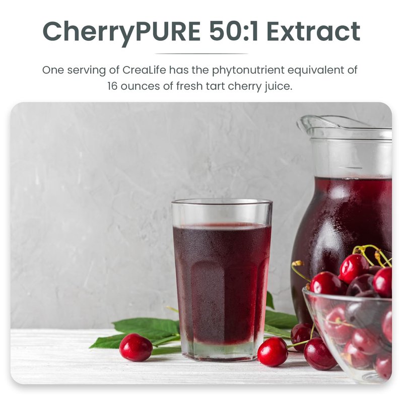 - POWER-PACKED WITH ANTIOXIDANTS: USA-grown CherryPURE Montmorency tart cherry extract supports muscle recovery, reduced inflammation, and better sleep. One serving of CreaLife provides the phytonutrient equivalent of 16 oz of fresh, pure tart cherry juice. CherryPURE tart cherry can reduce muscle soreness and increase endurance.