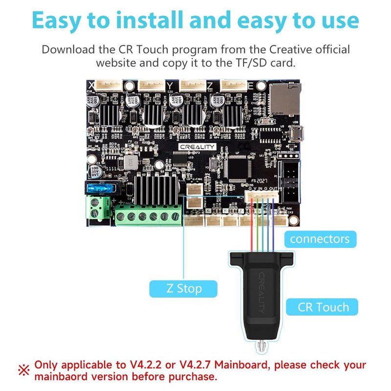 - 【Wide Application】This Creality cr touch auto-leveling kit is equipped with 3 mounting brackets and is only suitable for the following 3D printers with V4.4.2/V4.2.7 motherboards (Ender 3/Ender 3 Pro/Ender 3 V2/Ender 5/Ender 5 Pro/cr 10), other machines are not compatible. Please confirm your machine and motherboard version before purchasing.