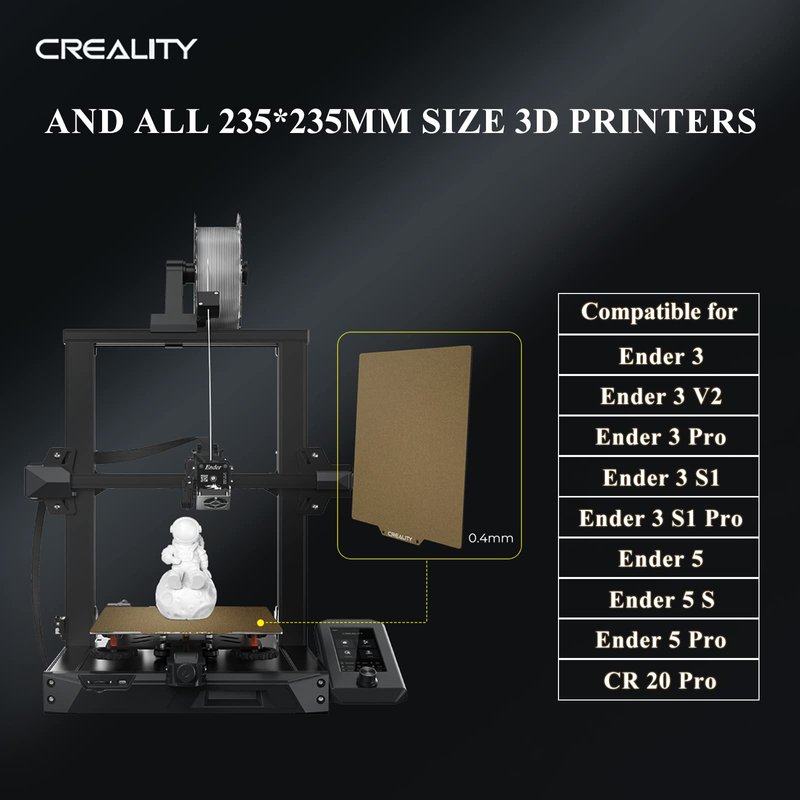- 【Wide Application】The size of ender 3 PEI is 235*235mm(9.25*9.25inch). please re-level it to improve the printing effect. it is applicable with Creality 3D printers such as Ender-3, Ender-3 Pro, Ender-3 V2, Ender-3 S1,Ender 3 S1 pro,Ender 3 neo,Ender 3 v2 neo, Ender-5, Ender-5 Pro, CR-20, CR-20 Pro, Voxelab Aquila, Voxelab Aquila C1, Voxelab Aquila C2 and and similarly sized FDM 3d printers.Compatible with PLA/PETG/PEEK/ABS and any other filaments.