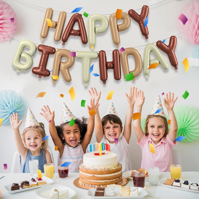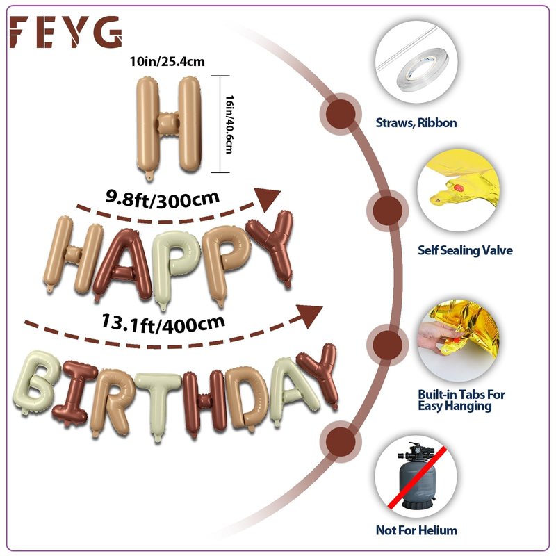 - Beige and Brown Happy Birthday Balloon Banner Set:16 inch cream foil letter happy birthday balloons.Each package come with 13 pcs independent letter balloons which can be combined into "HAPPY BIRTHDAY",1 pcs straw and 1 white ribbons 10 meters long.Create a memorable atmosphere with this versatile and stylish birthday balloon kit.