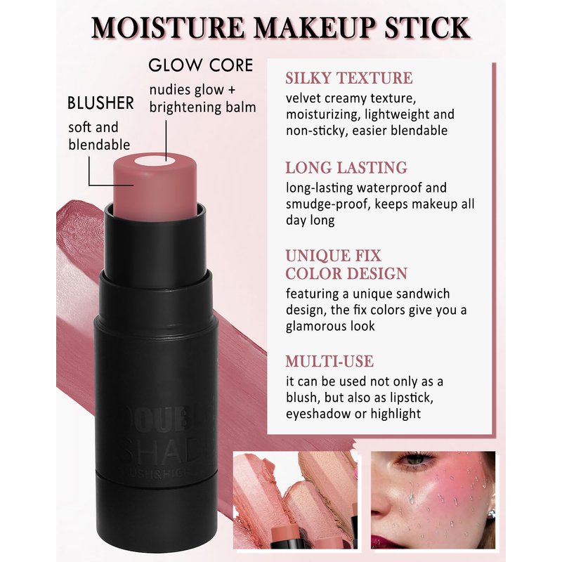 - Unique Design - Unlike traditional blushes on the market, this 2-in-1 sandwich blush stick has a facial brightening core in the inside, a smooth creamy formula and high-pigment blush on the outside, which blends effortlessly with all skin tones, leaving a lightweight, non-greasy feel natural shine finish in seconds.