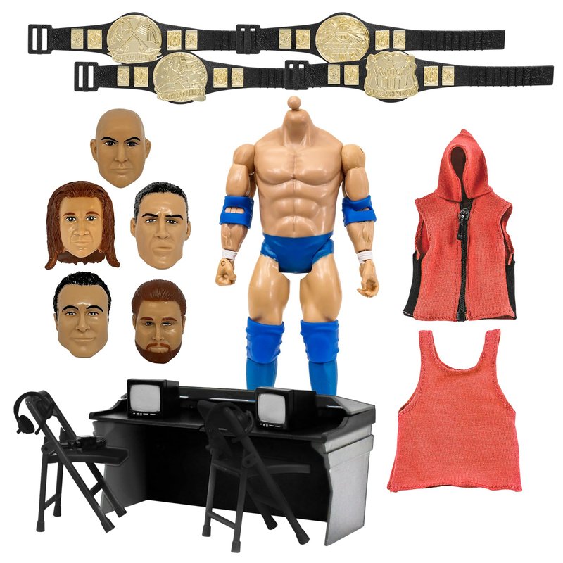 Step into the ring and let your creativity shine with the Create Your Own Talking Wrestling Action Figure Kit! This all-in-one set is designed to bring your wrestling figures to life with an array of customizable features that put you in control. At the heart of the set is a talking wrestling figure that allows you to record and playback your own voice. Imagine your action figure delivering signature catchphrases or taunting opponents with your unique voice! The figure comes with 5 swappable heads, giving you the flexibility to create different personas and characters for endless storytelling possibilities. Enhance your wrestling scenes with the included commentator table, complete with detailed monitors and chairs. Whether your action figures are strategizing behind the scenes or calling the shots during the match, this setup adds an extra layer of realism! Outfit your wrestler with a stylish vest and sweatshirt, perfect for pre-match hype or post-match interviews. And no champion is complete without their accolades – this kit includes 4 championship figure belts to celebrate every victory. Perfect for wrestling action figure enthusiasts, this kit is the ultimate addition to any wrestling collection. Get ready to record, customize, and dominate the ring like never before!
