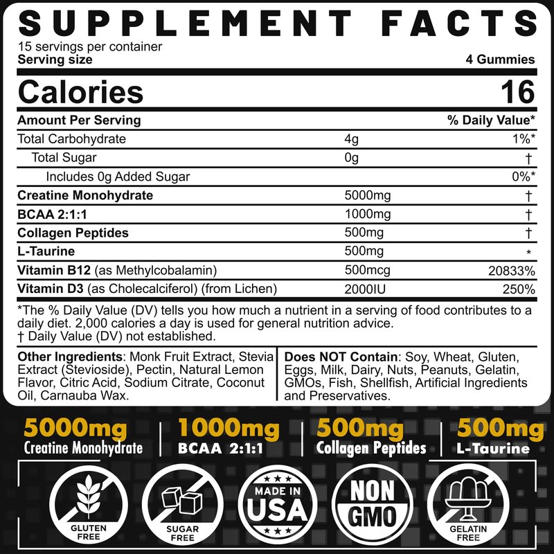 - 👍 【7000mg PER SERV - BETTER FORMULA】Our Creatine Monohydrate Gummies contain BCAA, Collagen peptides, Taurine, Vitamin B12 & Vitamin D3.