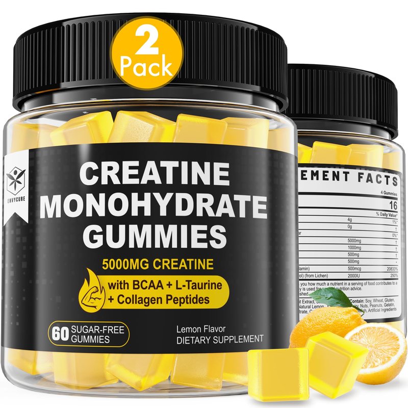 Creatine Monohydrate Gummies 5g for Men & Women, 7000mg with BCAA, Collagen Peptides, L-Taurine, Vitamin B12, D3, Chewables Creatine for Muscle, Delicious Natural Lemon Flavor, Sugar Free, 2 Pack