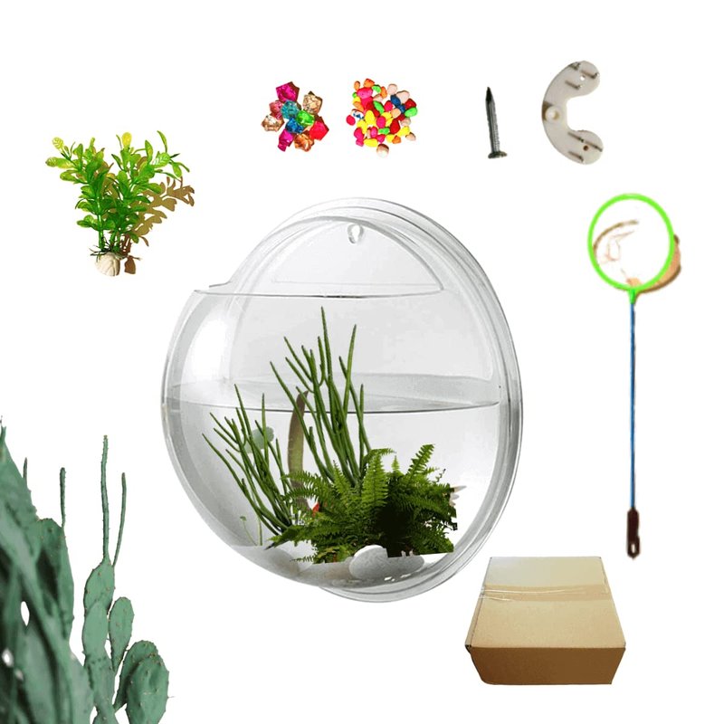- 💕 VARIOUS ACCESSORIES INCLUDED: This nordic wall mounted small aquarium is great for small spaces like kid's rooms, offices,tabletop, desktop,a housing of other small creatures. At the same time, fake plants, nails. colorful stones, fishing net included.