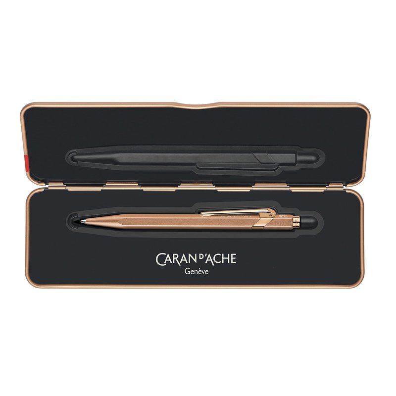 This Brut Rose from Caran d'Ache features a truly stunning and elegant rose gold colored body. Finished with a light dusting of glitter, this fine Swiss made writing instrument will appeal to a wide number of personalities. Flirty yet dignified, this hexagonal bodied pen will fit almost anyone's hand comfortably. While there is no real gold in the body, the clip and push button are plated with 1-2 microns of gold. Comes complete with a Goliath giant cartridge with the capacity to deliver 600 A4 pages of writing and a slim metal Slimpack case.