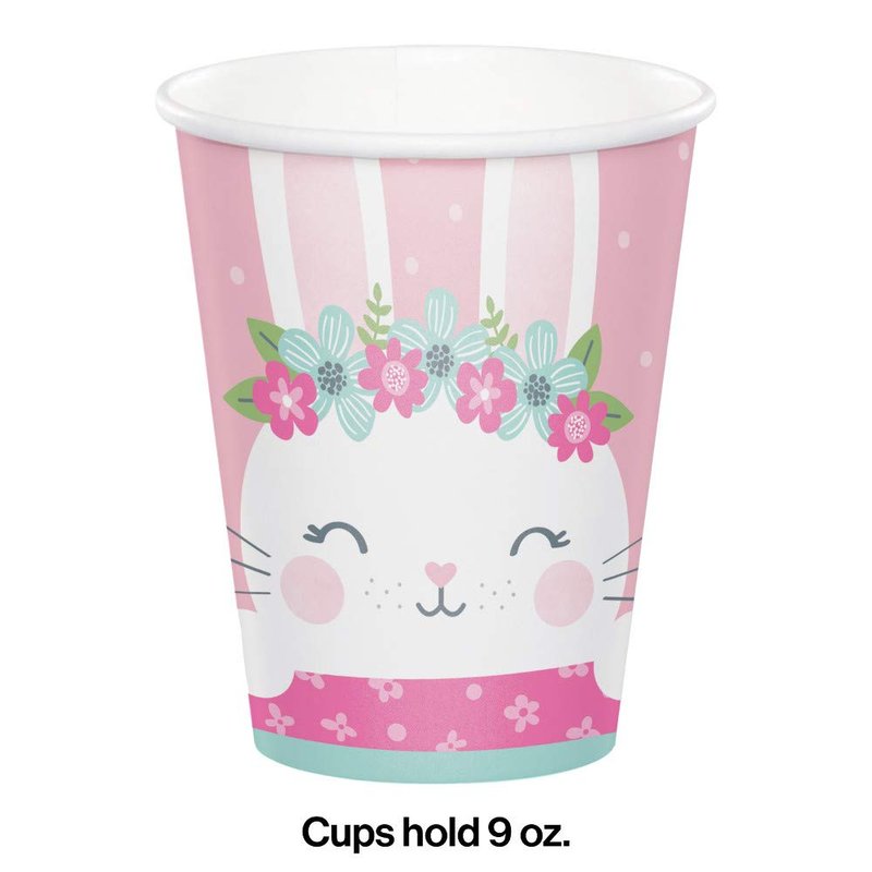 Put a smile on your guests' faces when you pass out hot or cold refreshments in the Bunny Party Cups. These 9 oz. paper cups have a light pink background with white polka dots and a dark pink border on the bottom with white stars. There is also a large, smiling bunny with her head in her hands and wearing flowers on her head. The cups are sold in packages of 24 and complement other party supplies from the Bunny Party collection.