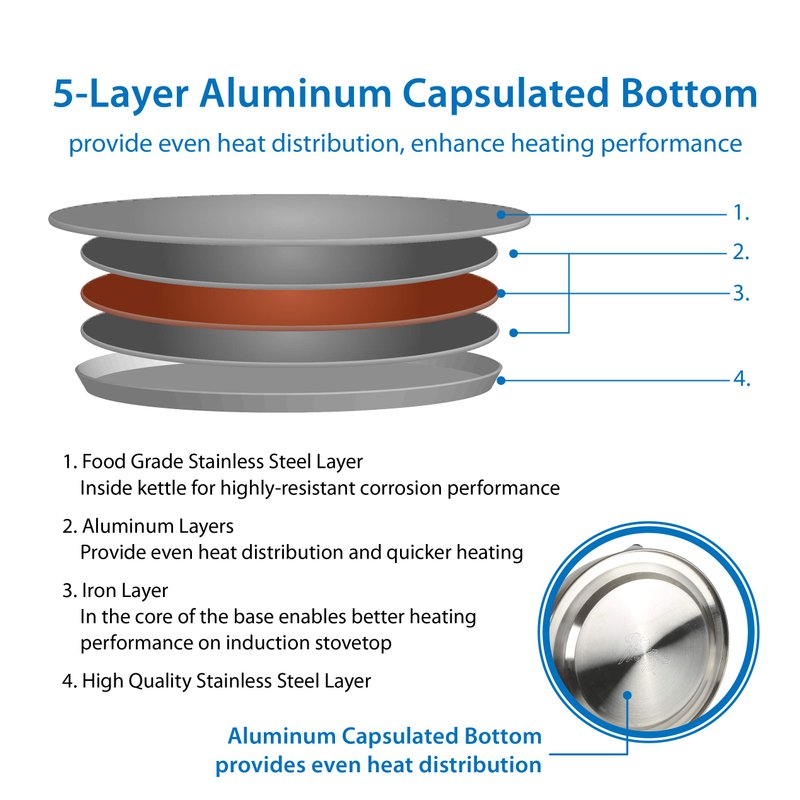 - BOILS WATER FASTER: The Creative Home tea kettle is made using 5 layers of an encapsulated base, to provide even heat transfer with its aluminum formed capsulated bottom that heats up quickly.