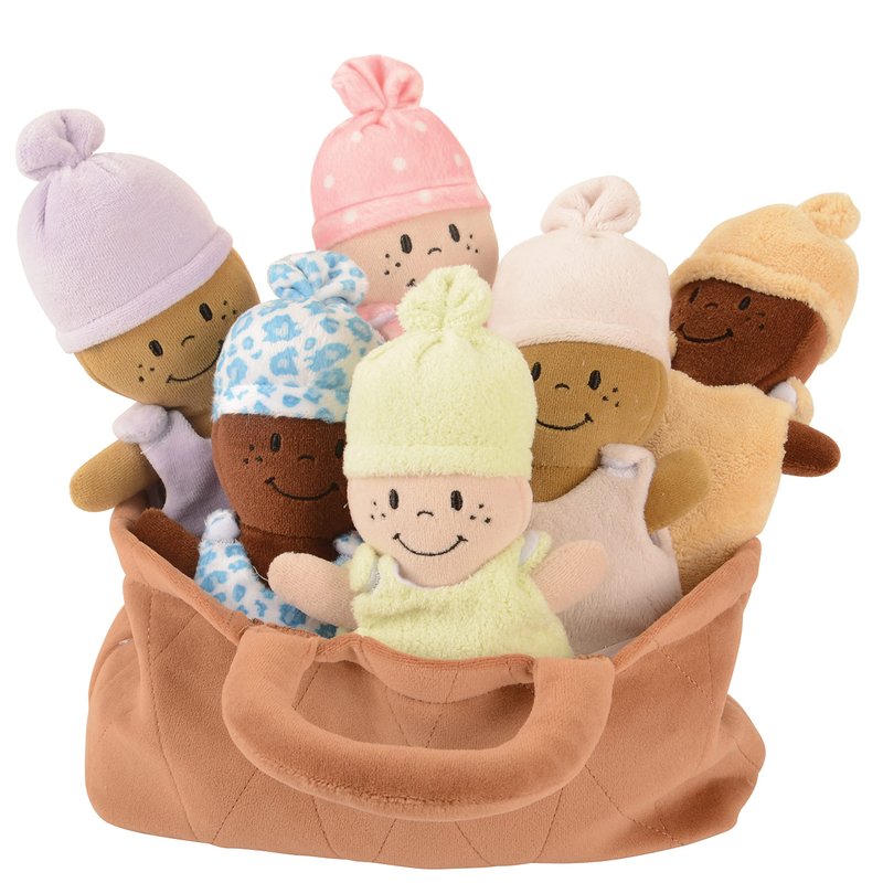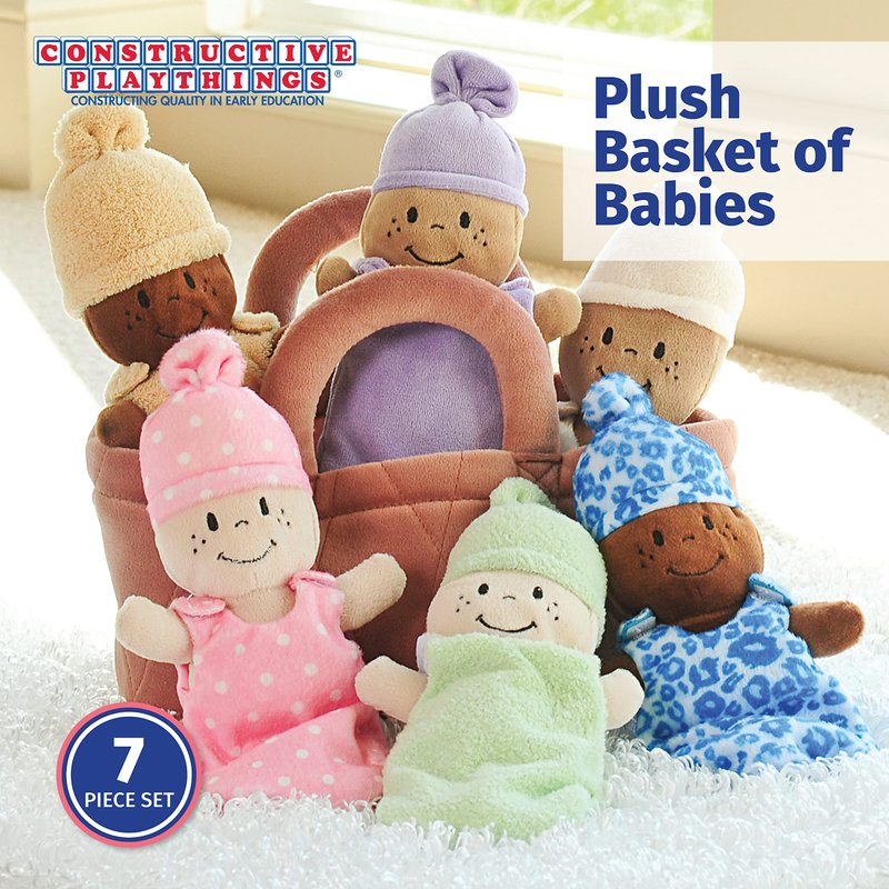 - PORTABLE: With six 10" long toy plush baby dolls in a 12” wide basket; this doll set is ideal for your home, classroom, waiting room, or any other place a child will need sensory entertainment