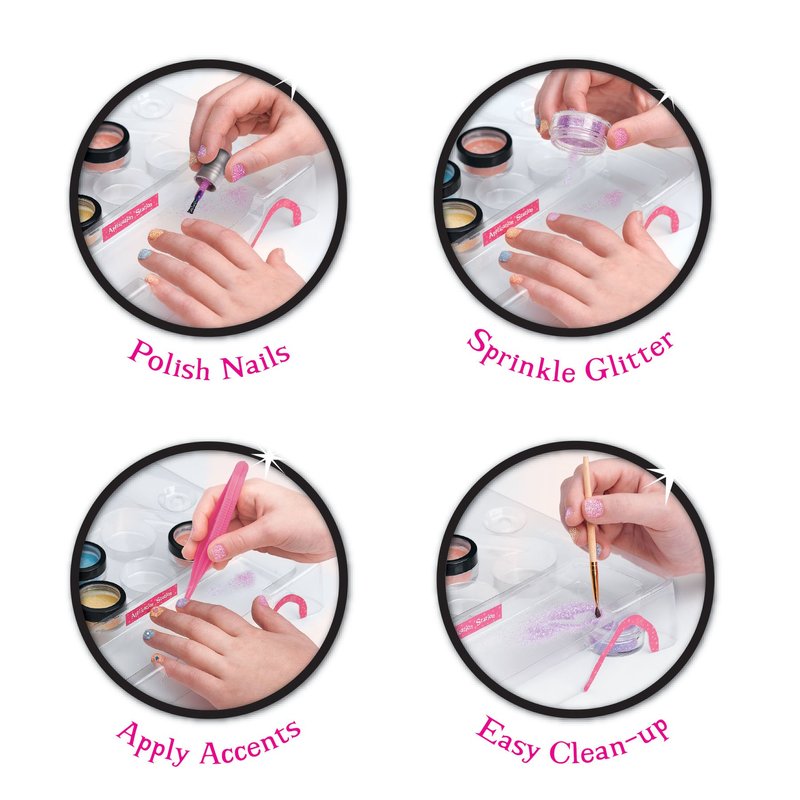 - COMPLETE NAIL KIT: Everything you need to create glitter nail art right at your fingertips. With plenty of sparkle, this kit includes: 3 bottles of water-based, peel off glitter polish, 6 glitter pots, confetti and rhinestones