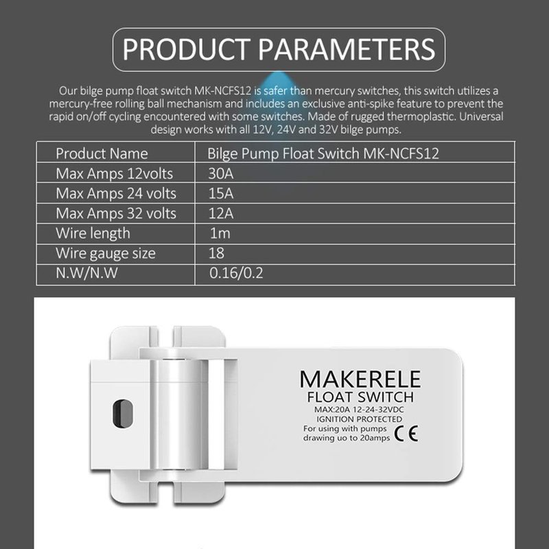 Bilge Pump Float Switch MK-NCFS12 A bilge pump float switch is a smart device used in boats that turns on a bilge pump when the water in the bilge reaches a certain level. It is a must-have in any boat that is left unattended for any length of time, as all boats tend to leak at least some water. This switch is submerged, so you need to waterproof the electrical connections and hang the wires to ensure they stay as dry as possible. Ideal flow sensor for bilge pumps Heavy duty flow switch is designed for the toughest applications Our bilge pump float switch MK-NCFS12 is safer than mercury switches, this switch utilizes a mercury-free rolling ball mechanism and includes an exclusive anti-spike feature to prevent the rapid on/off cycling encountered with some switches. Made of rugged thermoplastic. Universal design works with all 12V, 24V and 32V bilge pumps. 1. Turn pump on when water level reaches 2’’ (51mm) 2. Turn pump off when water level reaches 3/4’’ (19mm) 3. Ideal flow sensor for bilge pumps 4. Heavy duty flow switch is designed for the toughest applications Product Name Bilge Pump Float Switch MK-NCFS12 Max Amps 12volts 30A Max Amps 24 volts 15A Max Amps 32 volts 12A Wire length 1m Wire gauge size 18 N.W/N.W 0.16/0.2