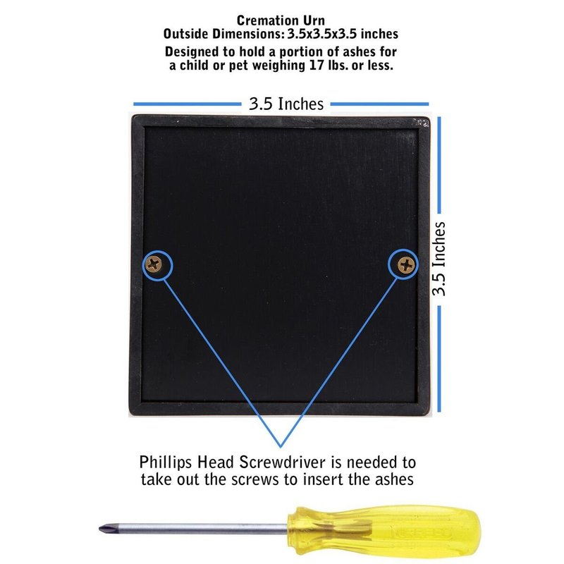 Our customers appreciate the attention to detail and elegant look of this Pet cremation urn designed to last for generations. The wood provides a warm look that accents any décor. This urn will hold the ashes of a loved one of approx 17 cubic inches. Access the bottom of the urn by simply unscrewing the 2 Phillips head screws to remove the base. This cremation urn is skillfully made in the USA Overall size is 3.5" l X 3.5" w X 3.5" h Include felt pads to protect furniture. This black maple keepsake urn can also be used as a SHARING URN to hold a PORTION of the ASHES for child or pet WEIGHING LESS than 17 lbs.