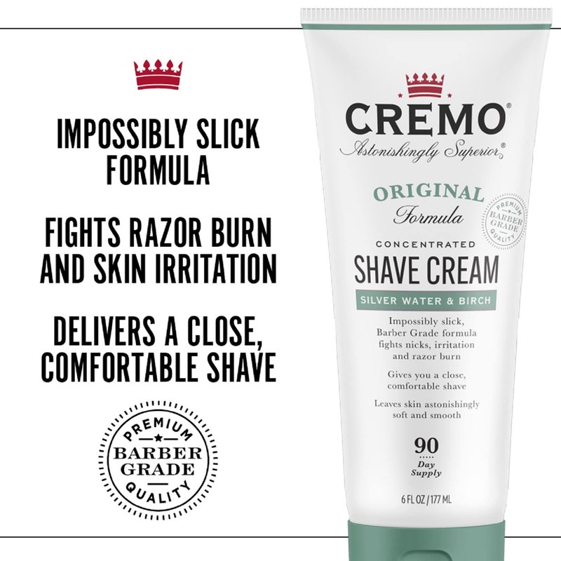 Cremo Barber Grade Silver Water & Birch Shave Cream, Astonishingly Superior Ultra-Slick Shaving Cream for Men, Fights Nicks, Cuts and Razor Burn, 6 Fl Oz