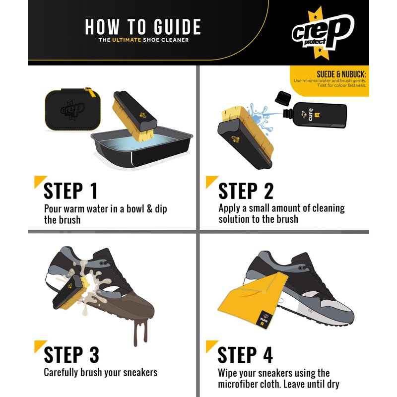- HOW TO USE - Using warm water and CURE solution, gently scrub Sneaker with the shoe brush and wipe clean using the Crep Protect microfibre cloth.