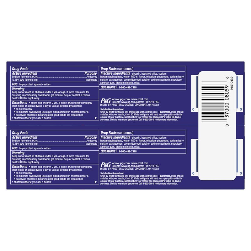 - Includes two 4.1 oz tubes of Crest 3D White Glamorous White Toothpaste