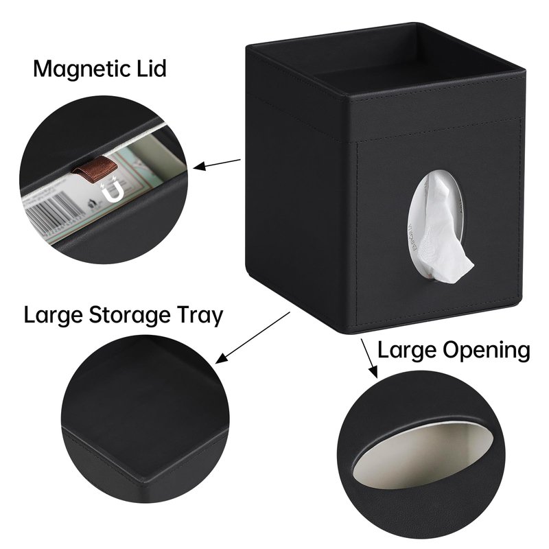 - Easy to Use —— The lid on the back of the leather tissue box cover can be easily opened and replaced with a new tissue box. The lid has a built-in magnet that will hold the tissue box cover tightly after it is closed to prevent tissues from falling out.