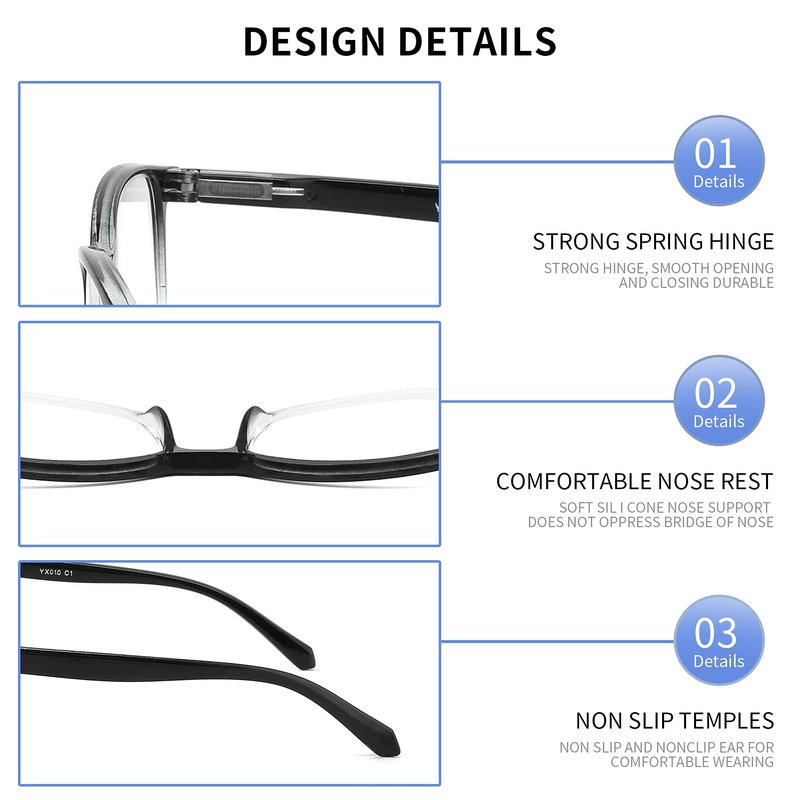 - ✔️【READING GLASSES】:No glare & clear vision make it convenient for reading, useing computer, working, living, etc,durable spring hinge ensures comfortable wearing, suitable for most face shapes of men and women.