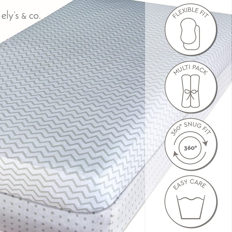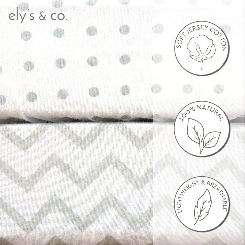 A Soft and Breathable, Lightweight Layer Ely’s & Co. Jersey Knit Crib Sheets are made of 100% High Quality Combed Jersey Knit Cotton fibers. Our t-shirt soft sheets are breathable, lightweight and feel great against your baby’s sensitive skin. Complemented by delicate and soothing design, these sheets create a warm, and welcoming sleeping environment for baby. Unlike woven cotton, jersey knit fabric is naturally stretchy and wrinkle-free which makes for easy care. Snug and Secure SafetyLike all Ely’s & Co. products, our Crib Sheets are designed with your little one’s safety in mind. We understand the importance of safeguarding your baby’s sleep environment against potentially hazardous situations due to poor fitting bedding. A double reinforced 1.5 cm thick elastic band along the entire bottom edge of our sheets ensures a snug fit that helps to prevent sheets from bunching, sliding, shifting, and pulling up over mattress corners. Flexible Fit Featuring an adaptable elastic band, Ely’s & Co. Jersey Knit Bassinet Sheets offer a super stretchy, flexible fit while supplying a safe and secure, snug fit to all standard crib mattresses and toddler bed mattresses. Easy CareHere at Ely’s & Co., we know accidents happen, and sometimes they can be messy, so we created baby bedding options that are easy to care for and can withstand frequent wash and dry cycles. This bedding essential is a no-brainer addition to your Baby Registry.