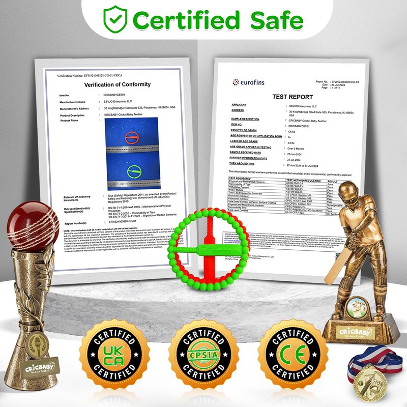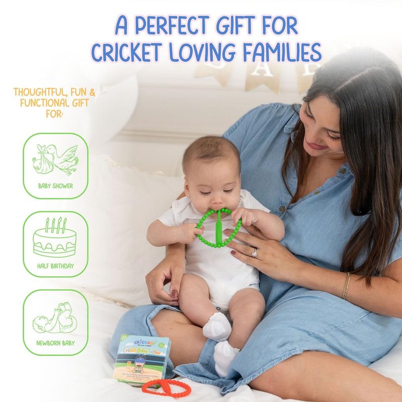 Soft & Safe: Made from high-quality, soft silicone, this teether is gentle on your baby’s gums while providing the relief they need. Teething Relief with 5 Soothing Textures: Designed with 5 unique teething textures to help massage and soothe your baby’s gums, making teething more comfortable. Cricket Bat & Ball Design: Inspired by the classic cricket bat and ball, this playful design is easy for babies to grasp and hold. Two Vibrant Colors: Comes in two eye-catching colors—Grass Green and Cherry Red—making it a fun and stimulating toy for babies. Certified Safe: This teether is certified safe for babies with CPSIA, UKCA, and CE compliance, ensuring it's free from harmful substances.