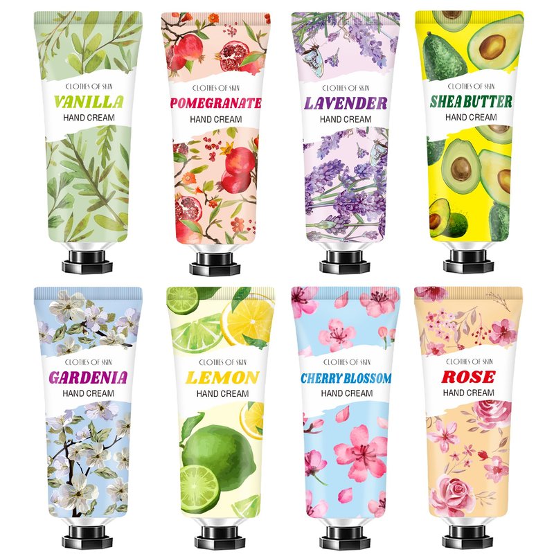 - 【8 Pack Natural Hand Cream Gift Set】8 different fragrances,Including Rose,Lavender,Gardenia,Pomegranate,Vanilla,Shea Butter,Lemon,Cherry Blossom fragrance hand cream.You can choose different fragrances every day to have a good mood.You can also share hand lotion with friends and familys.