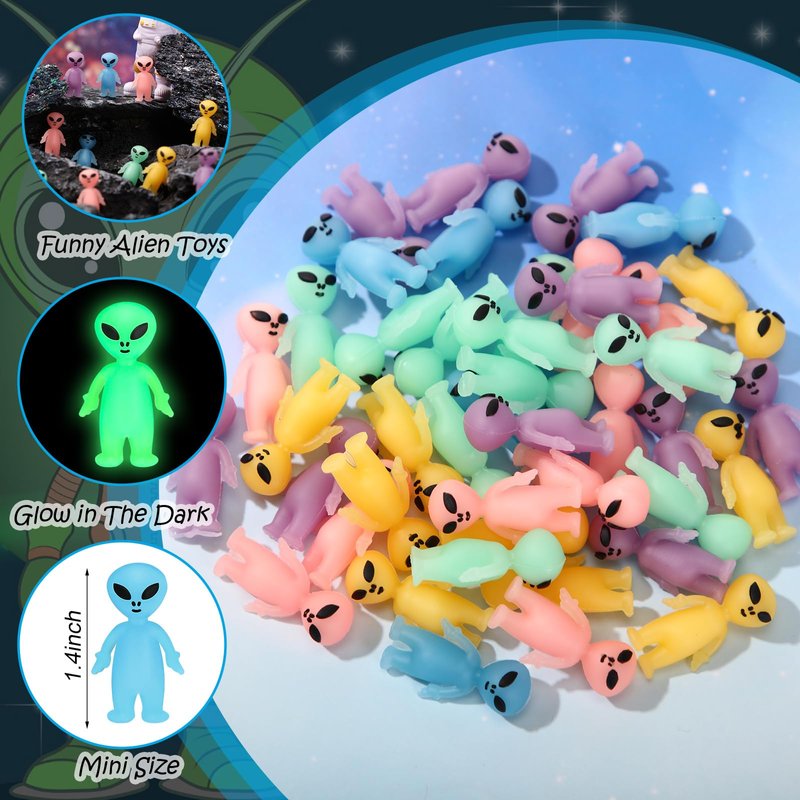 - Mini Alien Figures: discover a world of fun and imagination with our pack of 50 mini alien figures; Ideal for Halloween parties, themed celebrations, holiday rewards, and goody bag fillers, these little aliens promise hours of creative playtime that never has to end when the lights go out