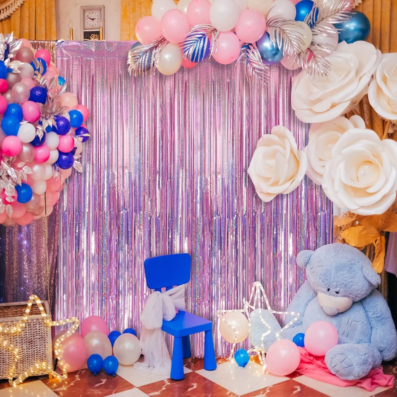 Iridescent pinkish foil fringe curtain backdrop for parties