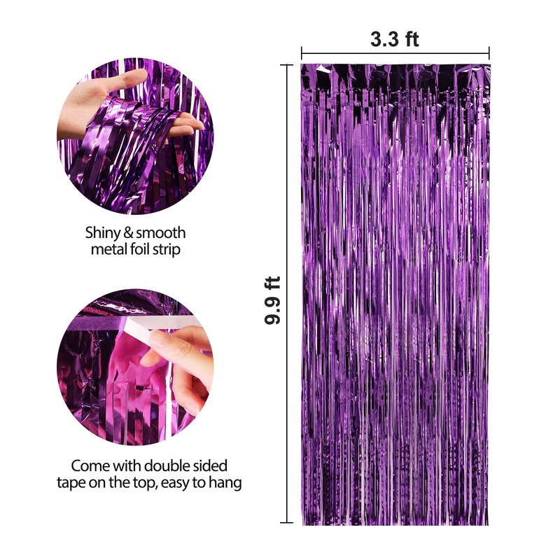 - Customer Service - 3 packs of foil fringe curtains, the size of each tinsel curtain is 3.3 ft x 9.9 ft, enough length for hanging on a door or covering a wall fully, suitable for any parties. If you are not satisfied with our foil fringe curtains party decorations, Please contact us we guarantee to give you 100% full money back.