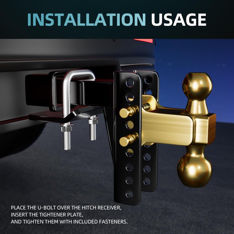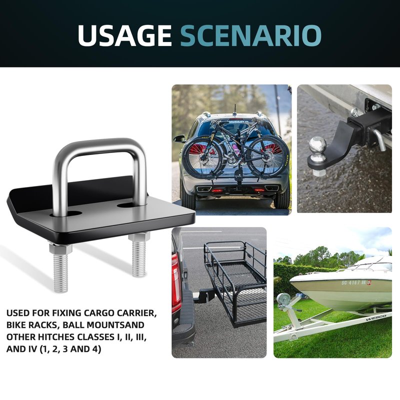 - 🔩 【Quick Installation and Attention】Sliding the U-bolt over the stinger, sliding the tightener plate onto the U-bolt, cover it with the original anti rust spring washer and flat washer, and tighten it with a nut. ATTENTION: If the ground clearance of the hitch is low and there is a risk of scrapping, it can be installed from the bottom.