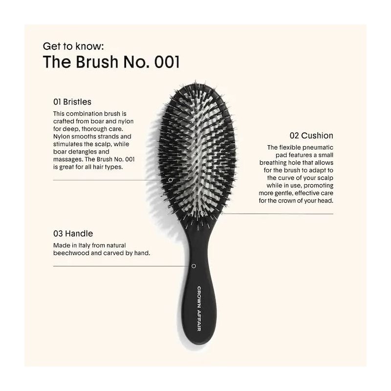 - Bristles: This combination brush is crafted from boar and nylon for deep, thorough care. Nylon smoothes strands and stimulates the scalp, while boar detangles and massages. The Brush No. 001 is great for all hair types.