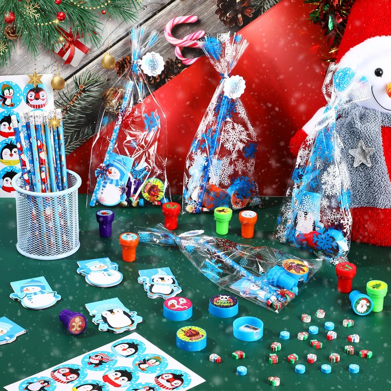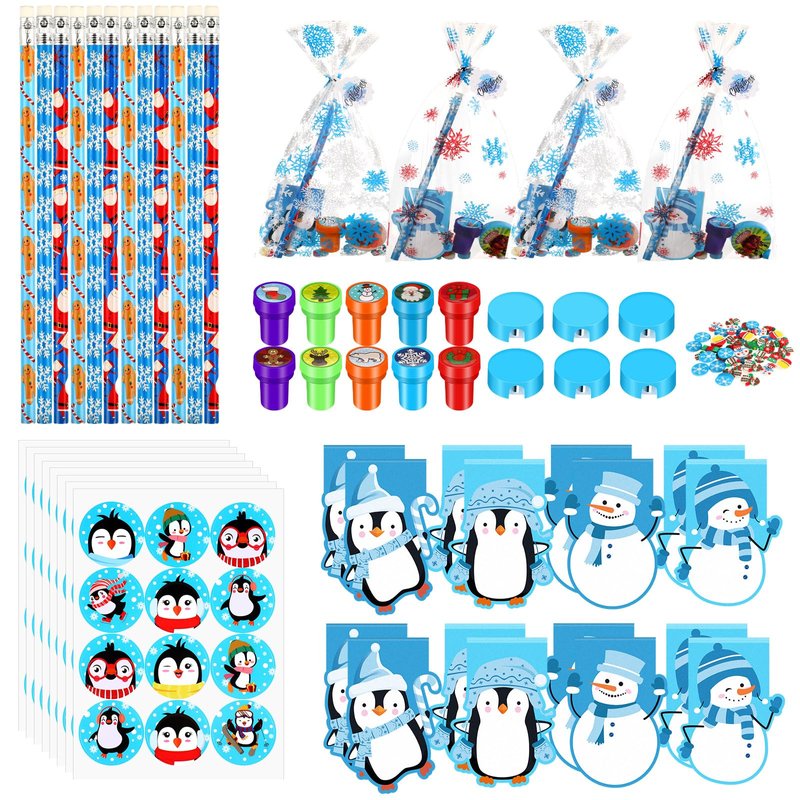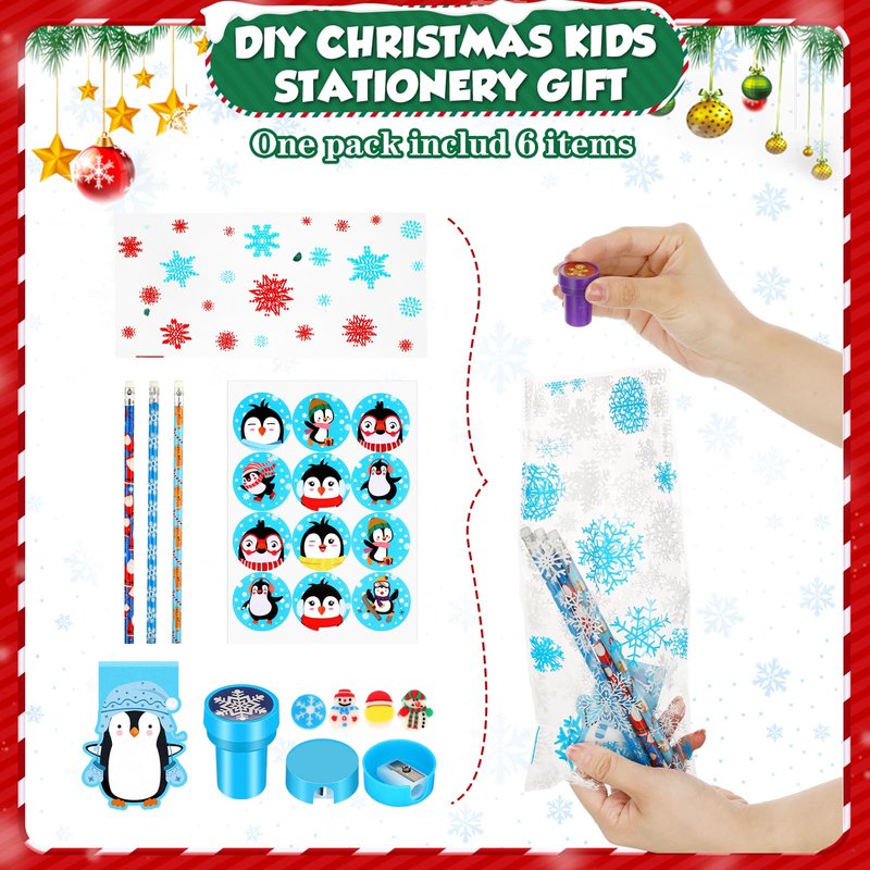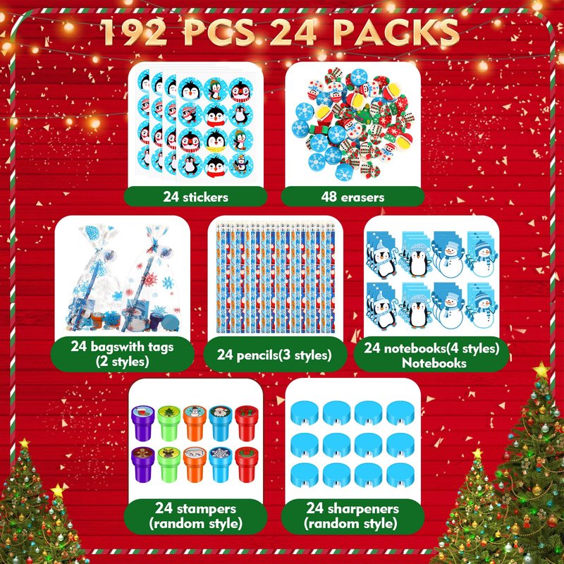 - Christmas Party Favors for Kids Classroom: you will get 24 x Christmas pencils, 48 pieces of Christmas erasers, 24 x Christmas notebooks, 24 x stickers, 24 x pencil sharpeners, 24 x Christmas stamps kids, 24 x treat bags with twist ties, and 24 x tags, nice combination to meet your various needs for Xmas party