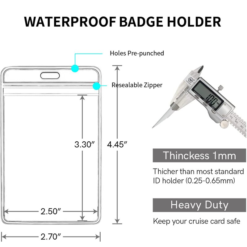 1. Our must have cruise lanyard size about 0.75IN (2 CM) width, 19.5IN (50 CM) length from neck to top of badge clip, and equipment with a waterproof PVC ID badge holder: 2.75*4.33 IN (7*11 CM), fits Princess, Norwegian, Carnival, Royal Caribbean, Celebrity, Holland America and all other major cruise line ship cards.