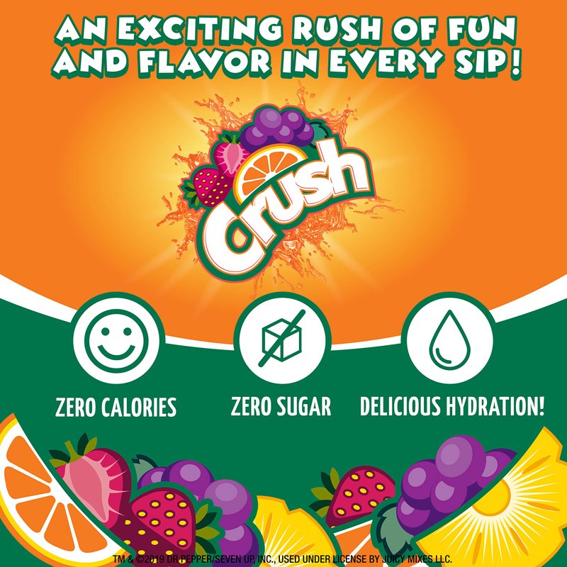 Available in a variety of delicious flavors, Crush water enhancers are the liquid drink mix for consumers looking for a fun way to flavor their water without the sugar. Easily make your own flavored water at home or on the go with these portable liquid drink mix bottles. To use, flip-open the cap. Point downwards directly into your water. And squeeze 1 second per serving in 8-ounces of water (squeeze longer to add more flavor)! Each portable bottle of Crush liquid drink mix makes 24 8-ounce drinks – with 0 sugar and 0 calories per serving. Use with your sodastream to make Crush flavored sodas. Or pack in your children’s lunch box to have them be the most popular kid at the lunch table. Crush drink mixes will have the whole family drinking 8+ glasses of water each day.