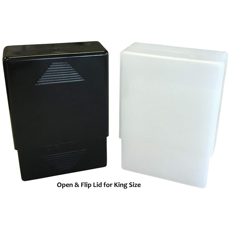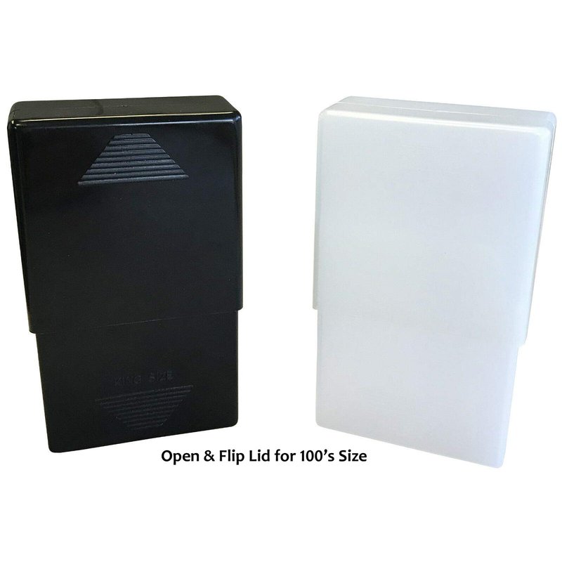 Flip Lid Around to Hold Either King Size or 100's! These sturdy, hard-plastic cases hold a whole pack of cigarettes with maximum protection. Flip lid around to hold either king size or extra long 100's. Available in either white or black.