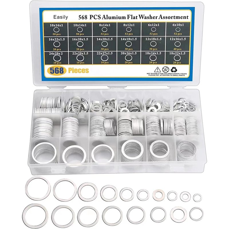【Total 568 pieces and 18 sizes, Pretty much every size you might need】M6 M8 M10 M12 M14 M16 M18 M20 M22 M24, the most commonly used aluminum washers in a plastic case, different size can satisfy your different needs.Whenever you need us, please free to contact us, we will give you a professional service