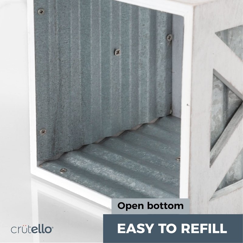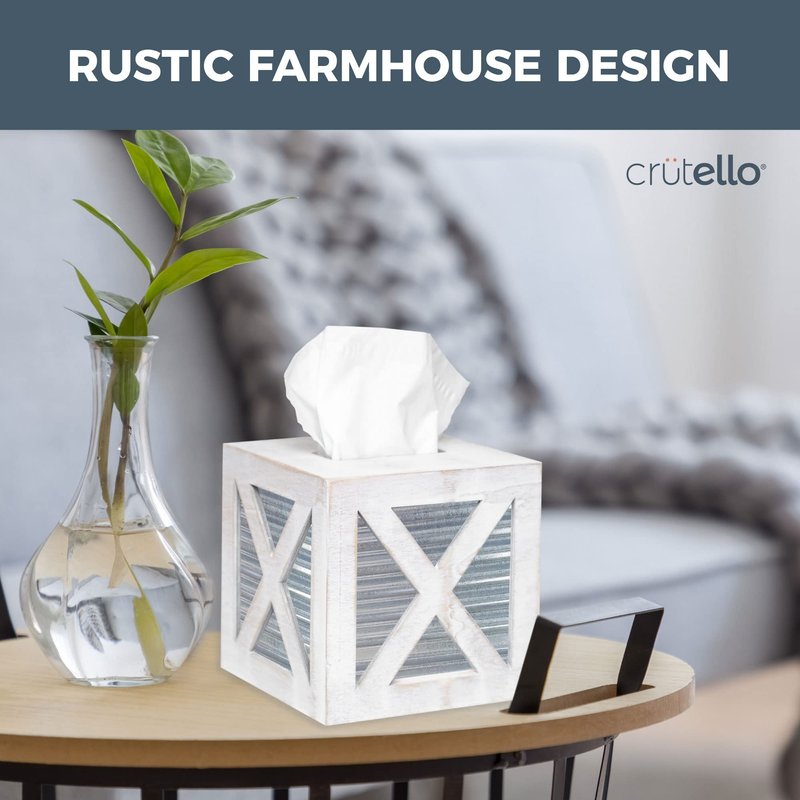 CLASSIC RUSTIC CHARM - This rustic white tissue box cover adds a touch of country charm to any room, with its galvanized sides and rustic farmhouse wood. DURABLE REAL WOOD - These tissue holders are designed with strong real wood that will last you for years to come. ELEGANTLY CONCEALED - This beautiful wooden tissue box holder keeps tissues at the ready within your home, while concealing the sometimes off putting paper tissue box artwork. QUICK REFILLS - This tissue box cover can be easily refilled through its open access bottom. 100% SATISFACTION GUARANTEE - Crutello stands behind all of its tissue boxes 100%. Please reach out to us with any questions or concerns, so we can help!