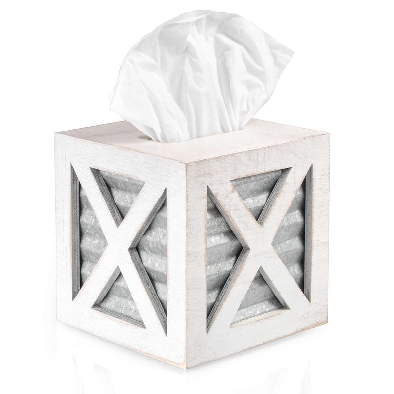 - CLASSIC RUSTIC CHARM - This rustic white tissue box cover adds a touch of country charm to any room, with its galvanized sides and rustic farmhouse wood.