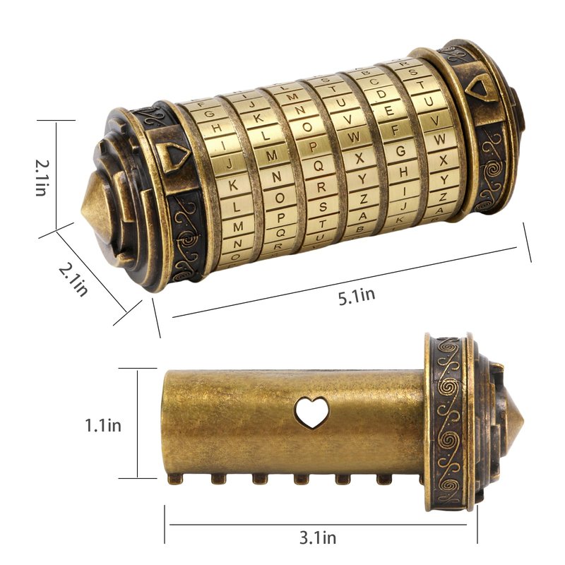 - 【PRODUCT USE】Da Vinci Code,Cryptex,in which more precious rings or necklaces, and so on.Can be used as game props, hidden clues!Can also be collected, as a memorial! 1 x Mini Cryptex Da Vinci Code Toy , Size: length about 15cm/5.91in, width about 6cm/2.36in, weight about 700g.ade of zinc alloy,Pretty and cool , you can als。