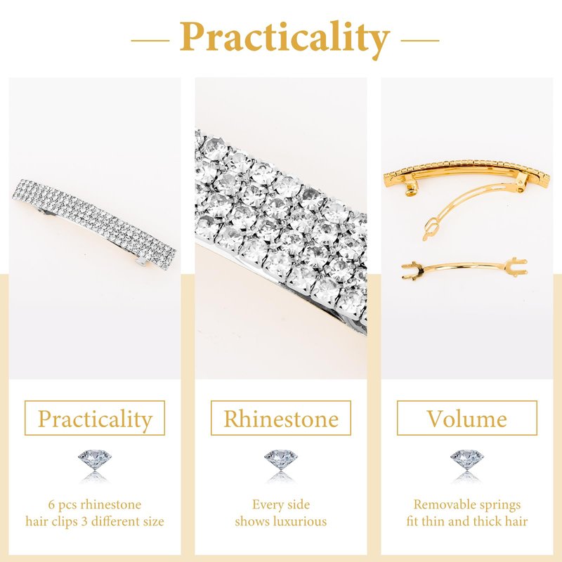 - Elegant 6 Pcs Clips Design: The set include 6pcs sparkle rhinestone hair clips with 3 different sizes, which can meet your daily matching needs.