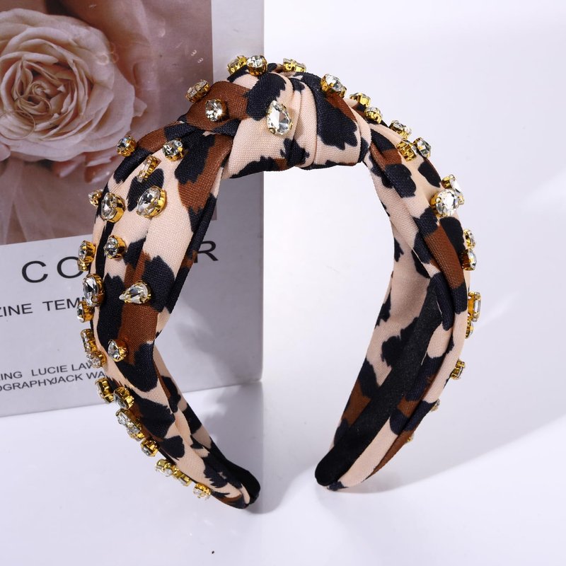Crystal Velvet Headband Leopard Cross Knotted Turban Headdress Colorful rhinestone Statement Wide Hair Band Hoop Accessories For Women Girls (Leopard)