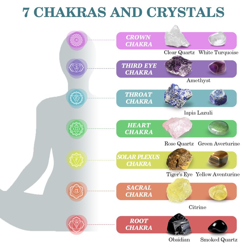 7 Chakra Stones:Clear Quartz, Amethyst, Obsidian, Lapis Lazuli,Rose Quartz,Citrine,tiger's eye 7 Tumbled Stones:Clear Quartz, Amethyst, Obsidian, Lapis Lazuli,Rose Quartz,Citrine,tiger's eye 1 crystal pyramid 1 crysatal necklace 1 chakra tree of life 1 pendulum board 1 selenite stick 50g crystal chips 1 chakra Bracelet 1 clear quartz crystal pointed stones 1 handmade vintage gift box 2 velvet pouches