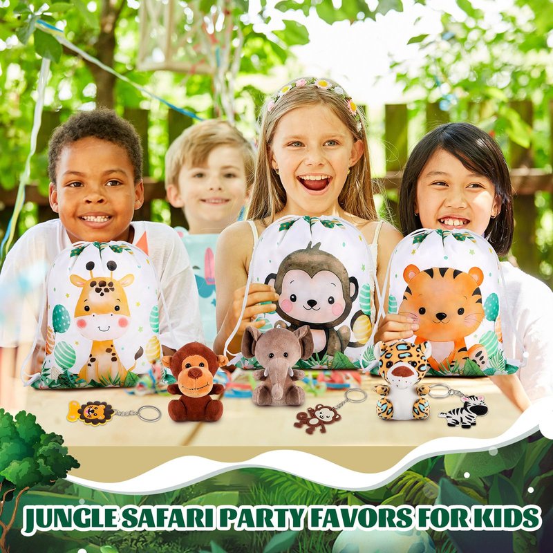 Features: The jungle theme party favors are lively and cute in appearance, so you can place them on many scenarios to make decorations. They can match your other decoration very well, bringing a more enjoyable party experience. Our safari party supplies adopts various popular animal elements, such as elephants, monkeys, lions, deer, leopards, tigers, giraffes and so on, simulating a small safari world, lighting up your party. Specifications: Main material: Drawstring backpacks: polyester Animal dolls: plush, PP cotton Animal keychains: PVC Color: as the picture shown Size: Drawstring backpacks: 11.8 x 9.8 inches/ 30 x 25 cm Animal dolls: 3.9 inches/ 10 cm of the sitting height Animal keychains: 3.94 x 1.18 inches/ 10 x 3 cm Package includes: 12 x Drawstring backpacks 12 x Animal dolls 12 x Animal keychains Notes: Manual measurement, please allow slight errors on size. The color may exist a slight difference due to different screen displays. Little ones should use our product under the supervision of adults.
