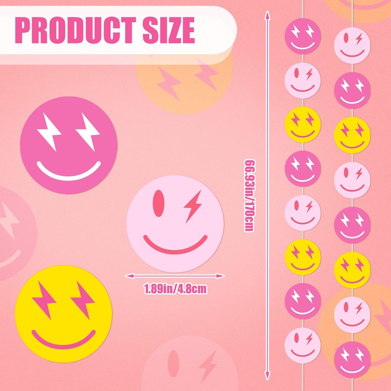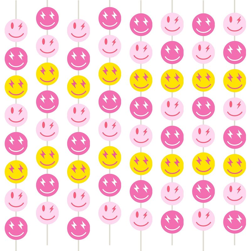 Features: The smile face hanging banners have cute design and bright colors, making them more appealing and adding a cheerful and vibrant touch to preppy parties. The preppy party decorations are made of quality paper, lightweight, and easy to hang and convenient to use. It could be reusable, so with proper storage, you can also use them for other parties or events. Specifications: Material: paper Main color: rose red, pink, yellow Size: Length of the banner: approx. 55 inches Diameter of the smile face: approx. 3.4 inches Package includes: 8 x Happy face banner Notes: Manual measurement, please allow slight errors on size. The color may exist a slight difference due to different screen displays. Winding risk may exist, please be careful when using the product.