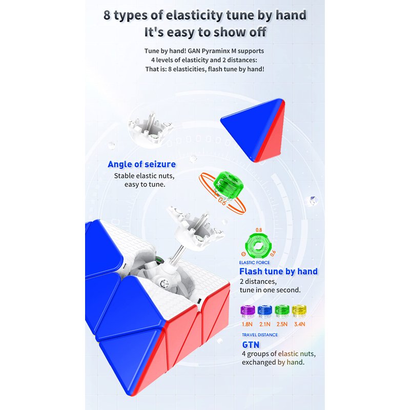 - ✅Tune with Ease🔧 - Don't know which setting suits you best? Try the GES+ (GAN Elastic System) design to explore easy tuning! Each nut has 2 distance slots to be tuned by simply push and twist. The larger the distance and the weaker the elastic force, makes the cube looser. Certain versions have 4 types of elastic nuts to change tensions.