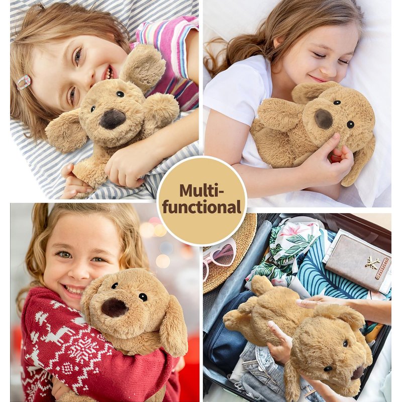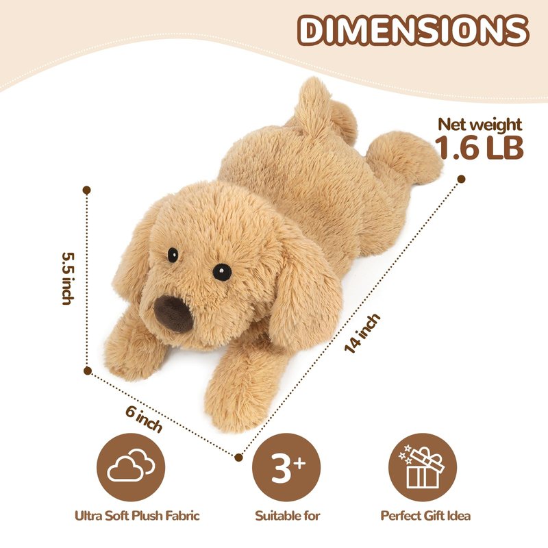 - LIFELIKE GOLDEN RETRIEVER APPEAEANCE: This plush is approx: 14"L x 6"W x 5.5"H in size. Meet your cutest puppy stuffed animal companion, resting in a cozy, lay-down position for added cuteness and comfort. This heating pad stuffed animal is irresistibly soft, featuring shaggy fur, an endearing facial expression. It's the ideal cuddle buddy, bringing warmth and joy to both kids and adults alike. A unique and delightful gift for any puppy lover, sure to add charm to any setting